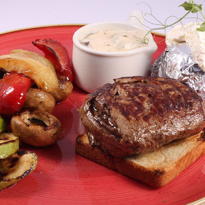 Sastav: Juneći file u prelivu od gljiva i neutralne pavlake uz grilovano povrće i punjeni krompir.