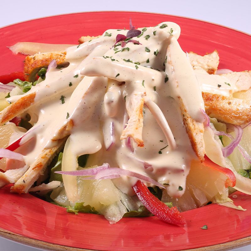 Sastav: Zelena salata, pileći file, crni luk, kalifornijska paprika, ananas, dresing od majoneze.