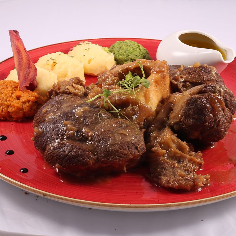 Ossobuco a la milanese je specijalitet pripremljen od dinstanog junećeg ribića sa koštanom srži, uz prilog krompir pirea.