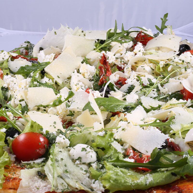 Sastav: Zelena salata, rukola, cherry paradajz, feta, mozzarella, gorgonzola, parmezan.