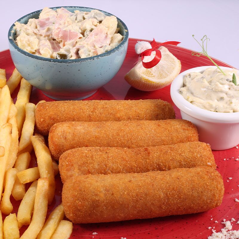 Sastav: Pohovana sa sirom / pohovana sa sirom i gljivama / sa sirom pečeno u furuni / servirano sa pomfritom a salata je po Vašem izboru: šopska, ruska, francuska ili krompir salata.