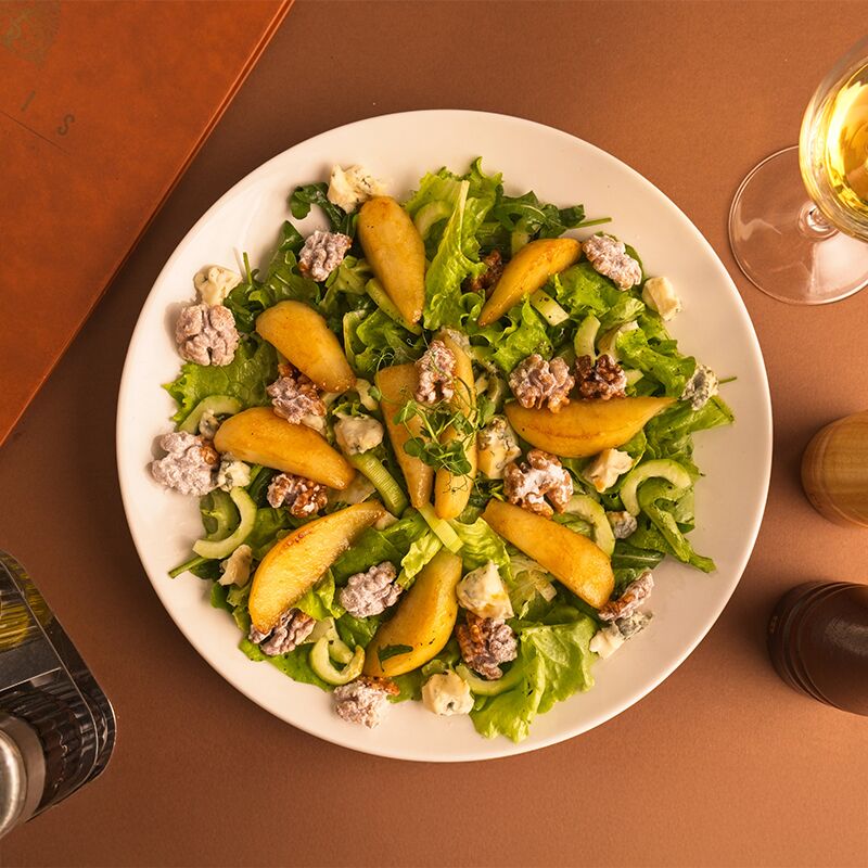 Osvežavajući mix salata upotpunjen kruškom flambiranom u brendiju, intenzivnim ukusom gorgonzola sira, hrskavim karamelizovanim orasima i aromatičnim dresingom od senfa.