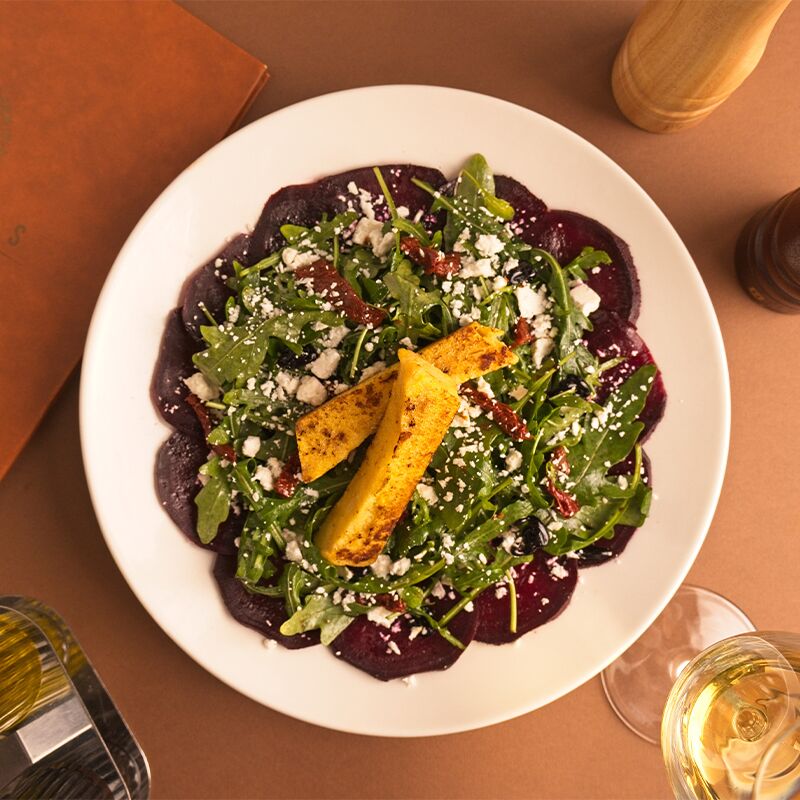 Bogata salata od karamelizovane pečene cvekle i kremastog kozjeg sira, upotpunjena aromatičnim sušenim paradajzom, svežom rukolom i specifičnim aćeto dresingom od maline.