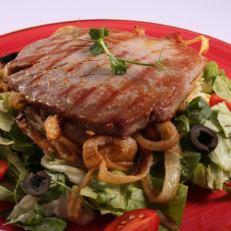 Sastav: Stek od tune se sprema uz podlogu od rukole, maslina, belog luka, garnirano sa kolutićima prženog luka.