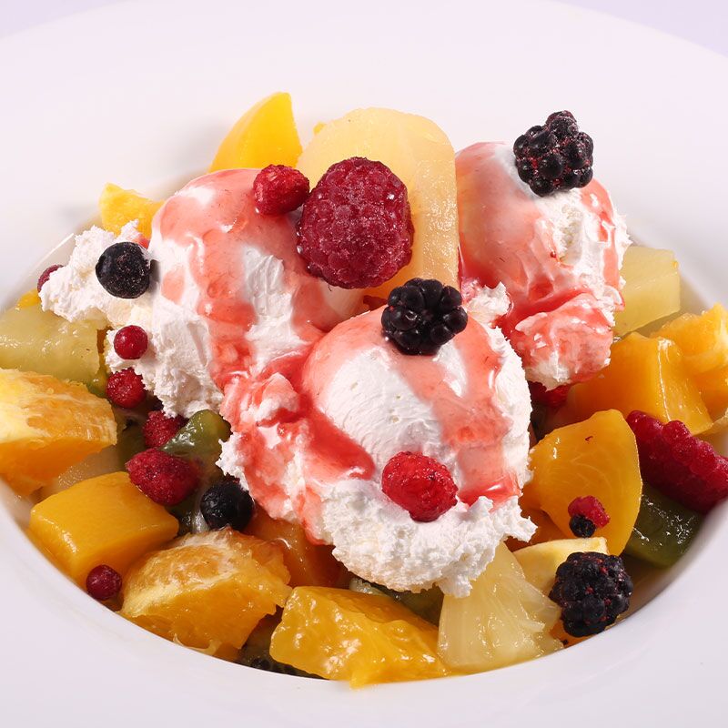Sastav: dnevni izbor voća, šlag, čokoladni preliv.